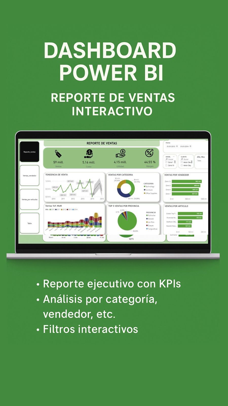 Obtendrás un dashboard en Power BI totalmente interactivo para analizar ventas, vendedores, categorías y más. ¡Listo para usar y personalizar!